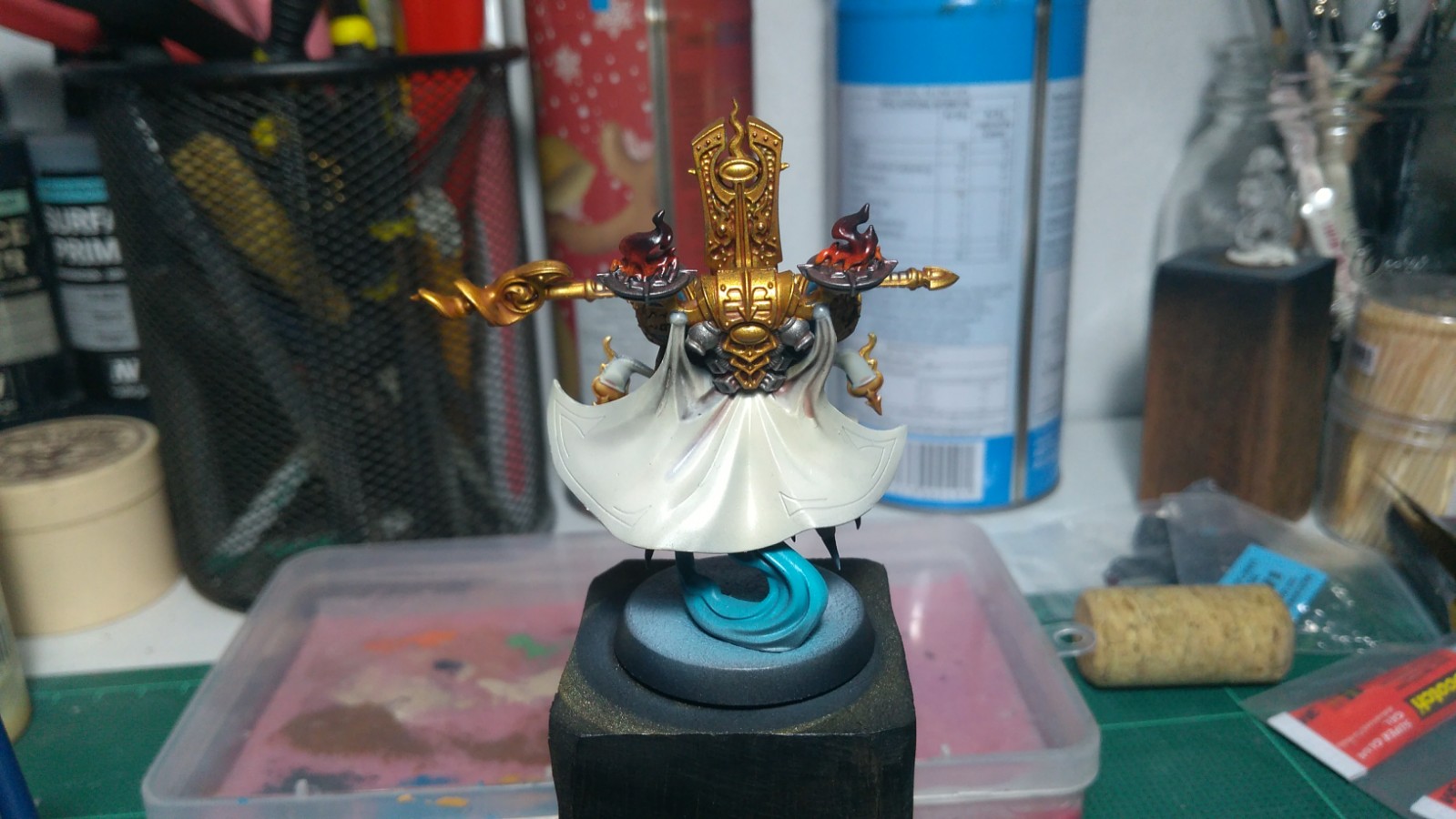 สีฟ้าบนเกราะ thousand sons blue และเหลือง averland sunset ทาลงไปยังไงก็ต้องมีเลอะออกนอกขอบบ้าง ก็ใช้ทาเก็บเอาทีหลัง พ่นgloss แล้ว wash ส่วนทองหลักๆด้วย fleashtone กับ nuln oil ในจุดที่เป็นสีเหล็กโลหะ ส่วนของผ้าไม่ค่อยไปแตะต้องอะไรมาก อยากให้มันดูสะอาดหน่อย